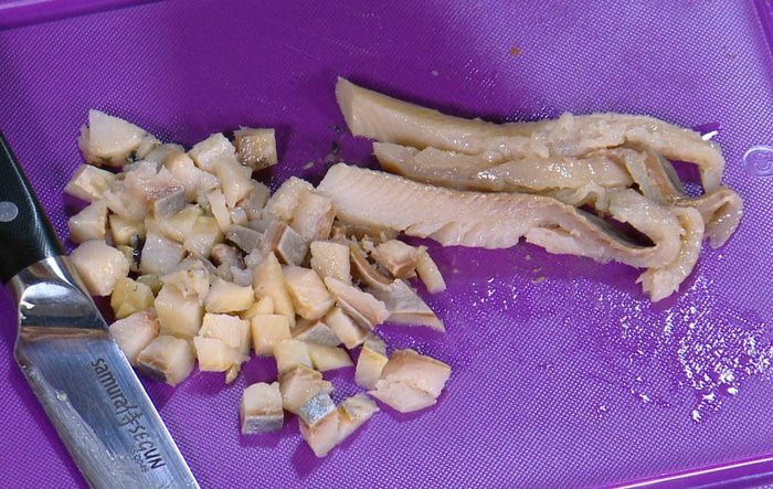 Филе сельди, яблоко и огурец нарезать маленькими кубиками.