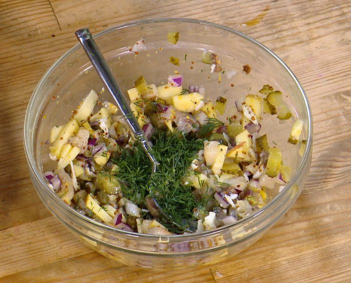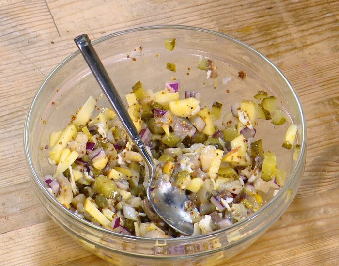Сельдь соединить с яблоком, огурцом, луком и каперсами, добавить горчицу и мед, посолить, поперчить, затем выложить в начинку одно яйцо пашот и все вымешать.