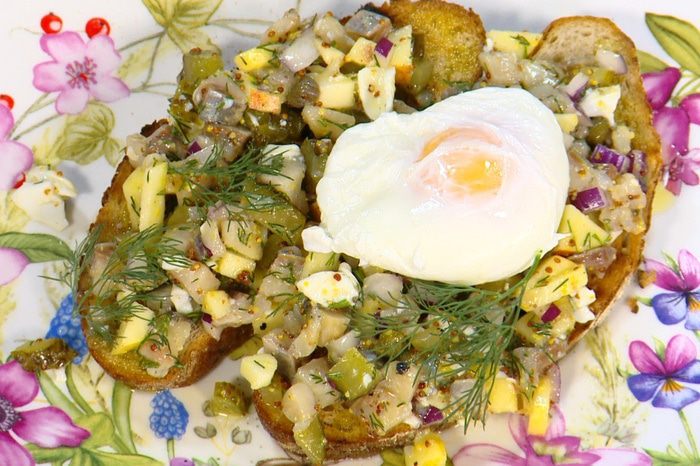 БУТЕРБРОДЫ С СЕЛЬДЬЮ, ЯБЛОКОМ И ЯЙЦОМ ПАШОТ