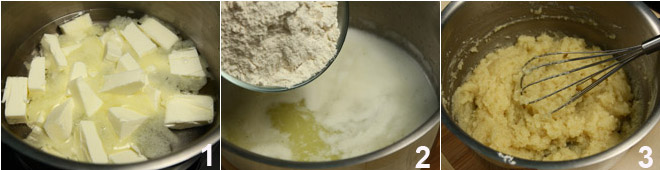 Рецепт Заварное тесто (профитроль, заварное пирожное), пошаговый рецепт с фотоЗаварное тесто (профитроль, заварное пирожное), пошаговый рецепт с фотоЗаварное тесто (от французского chou — капуста,обычно блюда из такого теста напоминают кочешки брюссельской капусты) — это воздушное и нежное тесто, которое в основном используют для приготовления заварных пирожных, профитролей (а также сладких колец, эклеров и т.д.) как со сладкой начинкой, так и с солёной. Заварное тесто высоко ценится в кулинарном искусстве и не нуждается в стандартах приготовления, оно отличается от других видов теста тем, что готовиться в 2 этапа: сначала в сотейнике на огне, а затем в духовке, в некоторых случаях, в воде или в кипящем жире.ИнгредиентыДля 60 профитролей:Сахар — 1 чайная ложка (для сладких)Вода — 200 млСоль — 1 щепоткаСливочное масло — 200 грЯйца — 4 средних (~ 50-55 гр одно)Мука — 130 грДлительность приготовления:30МинутСложность приготовления:ЛегкоКоличество проций:60DariaL