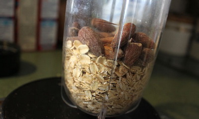 - Для данного шага понадобиться утварь для измельчения. Это может быть блендер либо кофемолка. С их помощью необходимо сделать своего рода муку из хлопьев овсяных, миндаля, молотого мускатного ореха, порошка разрыхлителя. Соответственно, составляющие нужно будет перемешать между собой до однородности.