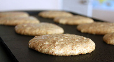 - Сковороду нагреваем. Выкладываем овсяное тесто на блинчики.