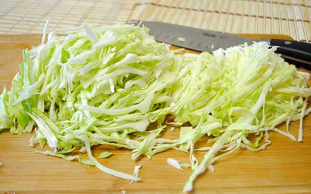 Капусту тонко нашинковать. Посыпать солью (чайную ложку набирать без горки) и слегка перетереть руками. Важно не пересолить. Так как соевый соус соленый.