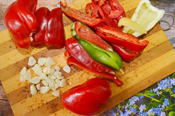 Почистить остальные овощи. Морковку натереть на терке, сладкий перец нарезать полосками. Жгучий перец нарезать тонкими колечками, чеснок пропустить через пресс.
