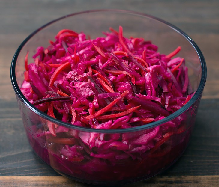 Приготовленная по этому рецепту капуста имеет красивый малиновый цвет.