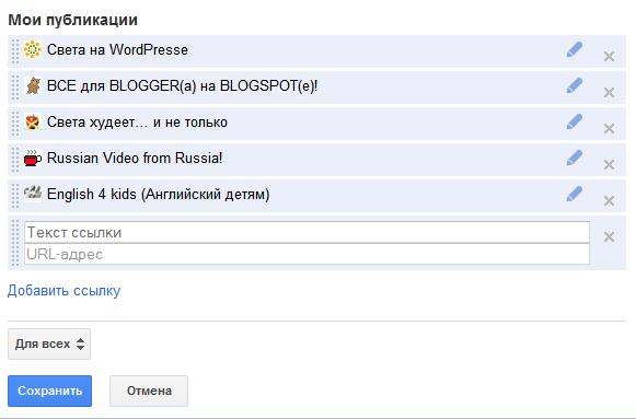 1. Добавьте в свой Google+ профиль ссылки на ваши публикации. Это легко сделать перейдя по ссылке: Мои публикации. Нажмите добавить публикацию и заполните поля текст и адрес ссылки и нажмите СОХРАНИТЬ.