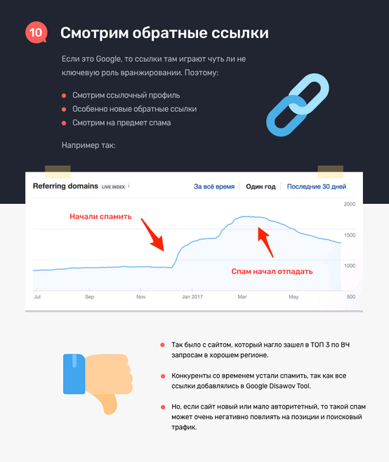 Очень часто мы сталкиваемся с тем, что на сайте резко падает посещаемость и нужно быстро реагировать. Пожалуй, чтобы долго не рассуждать, давайте наглядно изучим инфографику, где визуализированы самые главные моменты, на которые следует обратить внимание в первую очередь, чтобы понять почему посещаемость упала.