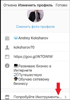 Шаг 1. Связываем страницы. Заходите с телефона (через мобильное приложение Instagram) в редактирование своего профиля и нажимаете там «Попробовать инструменты для компании».