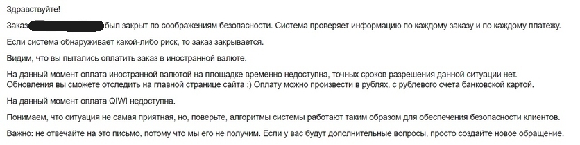 Торговая площадка, по многочисленным свидетельствам пользователей, начала отменять заказы, сделанные при помощи платёжной системы QIWI, сопровождая операцию сообщениями о проблемах с безопасностью аккаунта. При этом оформляется возврат денежных средств, который в некоторых случаях происходит с задержкой.