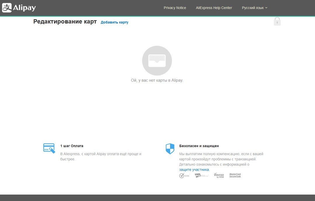 Банковские карты привязываются к профилю через систему оплаты Alipay. Отвязка или редактирование счета происходит там же. Если у покупателя уже есть аккаунт в системе, то при переходе в «Мой Aliexpress»-«Мой Alipay» он будет перенаправлен в Личный кабинет.