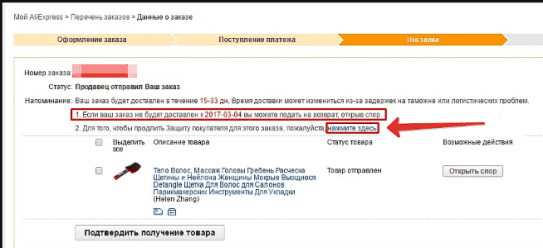 - Перед вами открывается напоминание о крайнем сроке доставки и возможности открыть спор, а также ссылка на продление защиты покупателя. Выбираем п. 2 и кликаем на ссылку.