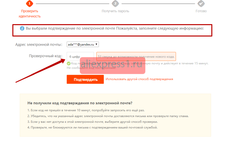 Выбрав возобновление личного кабинета по EMail, устройство переходит на этап проверки идентичности. Далее нужно будет щелкнуть на кнопку «Получить код». Устройство отправит на почту, сообщение с кодом, который надо будет ввести в графе «Проверочный код». Нажимаем «Подтверждаю».