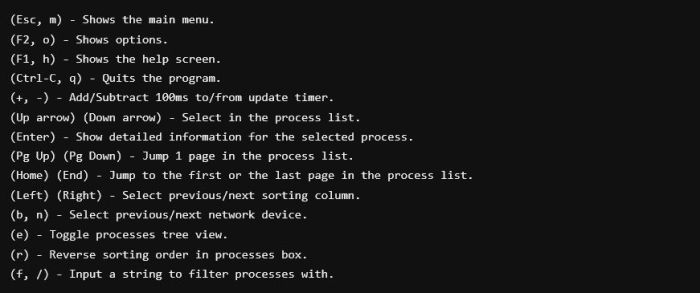 Help: отображает раздел справки, который включает сочетания клавиш и дополнительную информацию о том, как эффективно использовать btop.