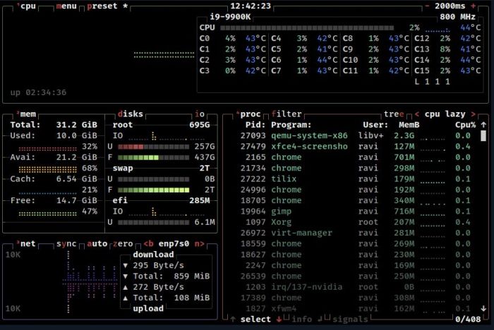 btop для Linux современный и визуально привлекательный диспетчер задач или системный монитор который работает из терминала и отображает использование ресурсов и статистику процессора, памяти, дисков, сети и процессов в режиме реального времени. Простыми словами это улучшенная версия htop, разработанную для того, чтобы быть ещё более интуитивно понятной и многофункциональной.