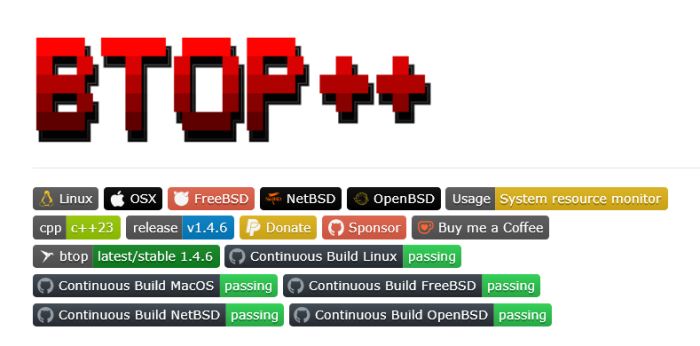 Программа написана на плюсах, отсюда и название. Называется она «btop++», но сайт не даёт вписать плюсы в название. Лицензируется под Apache 2.0. На странице много красивых скриншотов.