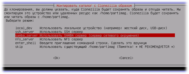 На следующем шаге нам будет предложено определиться с месторасположением ресурса, на который мы планируем скопировать создаваемый образ диска. Так как, исходя из нашей задачи, для этого будет использоваться общая папка на компьютере с ОС Windows, — мы должны выбрать вариант «samba_server»