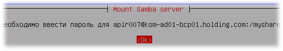 Далее нас попросят ввести имя компьютера, на котором расположен разделяемый общий ресурс. Зная то, что по DHCP мы получили корректные настройки как IP адреса самого компьютера, так и IP адреса работающих DNS серверов – указываем FQDN имя сервера, на котором нами заранее создана общая папка