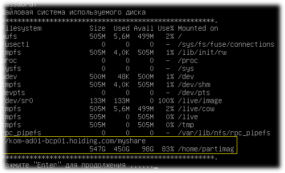 Вводим пароль, и если мы ввели его правильно и для этого пользователя действительно правильно настроены разрешения для доступа к обозначенной общей папке, – мы увидим экран следующего вида, который покажет нам (последняя строка таблицы), что сетевая папка смонтирована и теперь известен размер свободного места в этой папке.