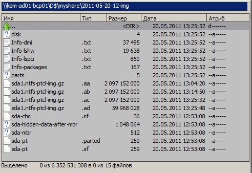 В конечном итоге в общей папке мы обнаружим большое количество файлов. Как видим, файлы образа диска сегментированы и упакованы файлами по 2000 Mb, что значительно сокращает объём занимаемого образом дискового пространства. В моём примере при размере данных на диске объёмом 12.8 Gb общий размер файлов образа составил 5,9 Gb.