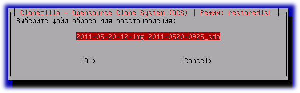 После этого Clonezilla прочитает данные из общей папки и покажет доступные для восстановления образы, сделанные нами ранее. Выберем образ, который мы хотим восстановить на новый жёсткий диск…