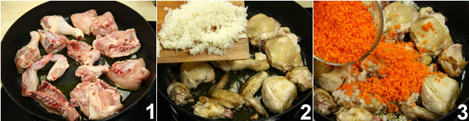 - Лук и морковь положить в сотейник вместо вынутого мяса и обжарить до слабого подрумянивания.