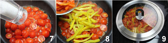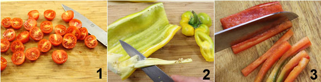 В салатник выложить листья салата, базилик, крупно нарезанные помидоры и маслины»