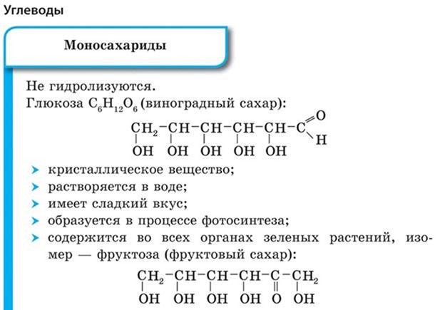 Моносахариды – это простейший вид углеводов, являются простой формой сахара, состоят из одного элемента. Твердые по своей структуре, вещества не поддаются гидролизу, быстро растворяются в H₂O, значительно хуже – в спиртах.