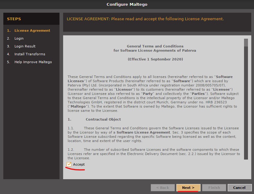 После нажатия на кнопку “RUN” мы получим окно настройки Maltego. Здесь нам нужно войти в систему и настроить Maltego в первый раз. Сначала нам нужно принять условия и положения Maltego, как показано на следующем снимке экрана: