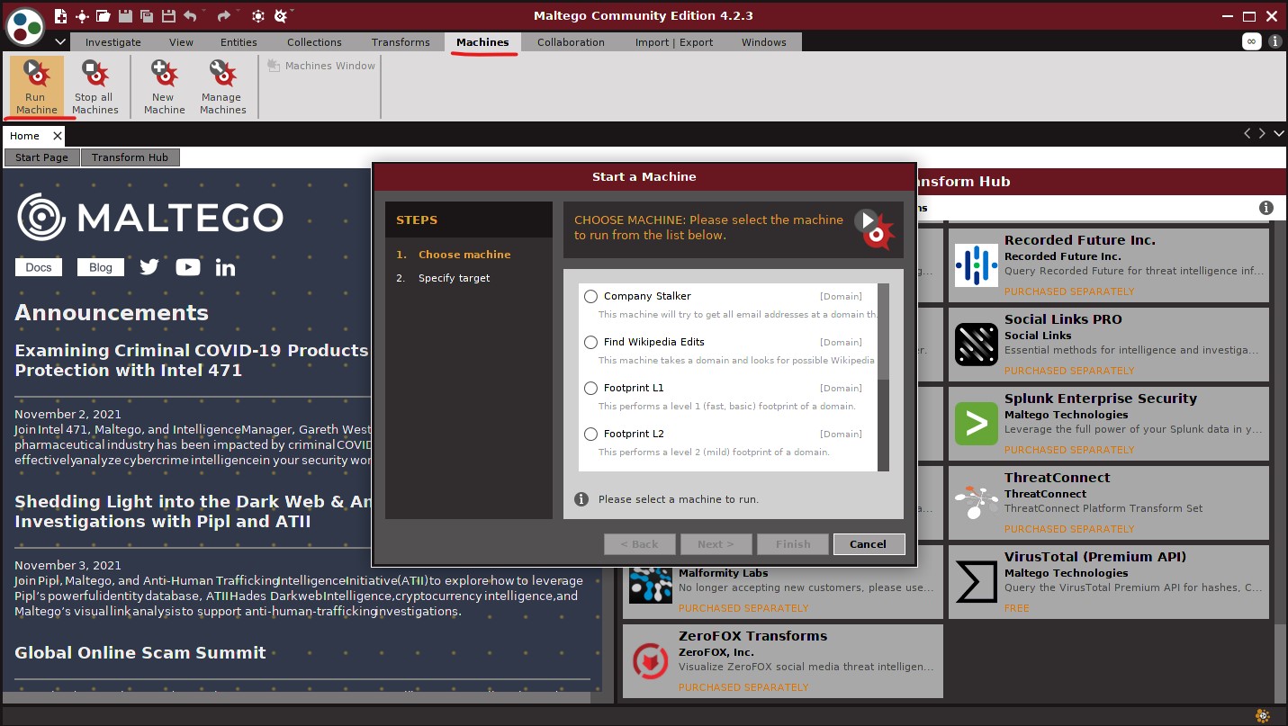 Теперь мы готовы использовать Maltego и запустить машину, перейдя к “Machines” в папке Menu и нажав на “Run Machine”; после чего мы сможем запустить экземпляр движка Maltego. Это показано на следующем снимке экрана: