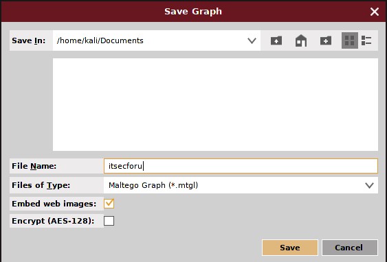 Если мы хотим поменять домен, необходимо сначала сохранить текущий график. Чтобы сохранить график, нажмите на значок Maltego, а затем выберите Сохранить. График будет сохранен в формате файла графиков Maltego ( .mtgl ). Опциаонально доступно также шифрование файла AES-128