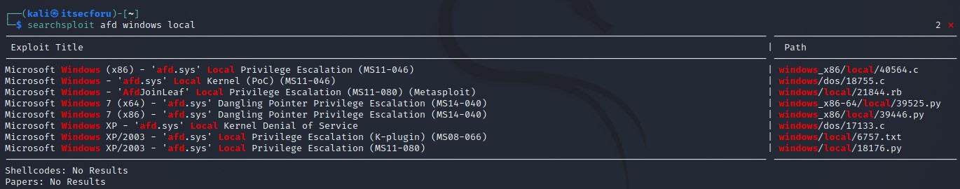 Обратите внимание на то, что SearchSploit использует оператор AND, а не оператор OR. Чем больше терминов используется, тем больше результатов будет отобрано.