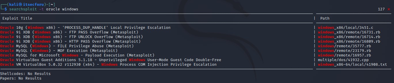 По умолчанию searchsploit проверяет оба заданных наименований на наличие эксплойтов и по пути к файлам. В зависимости от критериев поиска, это может привести к ложным срабатываниям (особенно при поиске терминов, соответствующих платформам и номерам версий). В таком случае поиск оптимизировать, выполняя поиск только по названиям используя параметр -t: