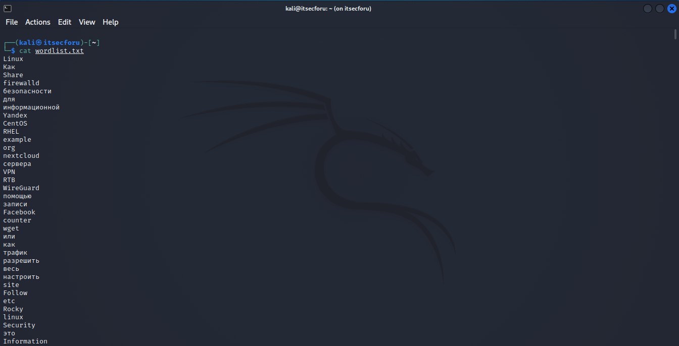 Далее используем команду cat wordlist.txt. Чтобы просмотреть содержимое файла