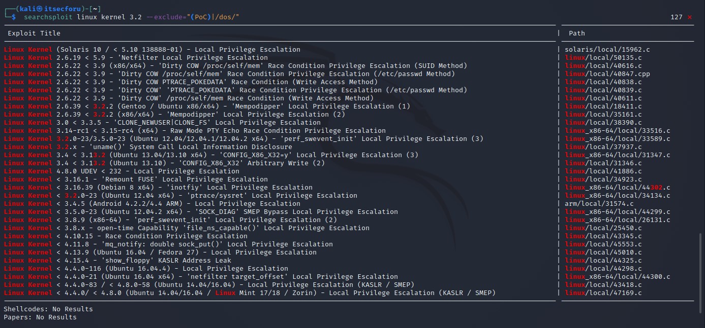 Совет: Выполнив команду: searchsploit linux kernel –exclude=”(PoC)|/dos/” | grep ‘ 3.2’ (пробел перед версией), вы получите еще более “чистый” результат (отсортированный по версии без заголовков).