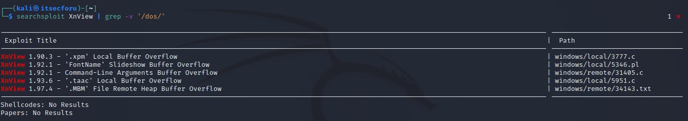 Вывод searchsploit можно направить в любую другую программу, что особенно полезно при выводе результатов в формате JSON (с помощью опции -j). С ее помощью можно удалить все нежелательные эксплойты с помощью grep. В следующем примере мы используем grep, чтобы отфильтровать все результаты “Denial of Service (DoS)”.