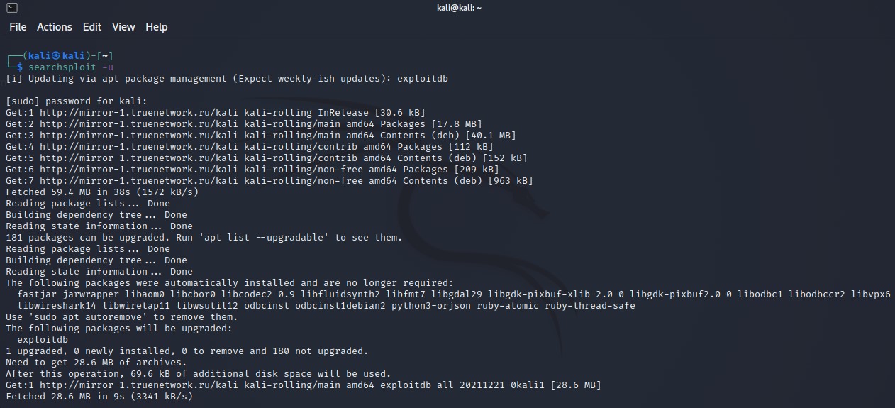 Независимо от того, как вы установили SearchSploit, все, что вам нужно сделать для его обновления, это выполнить следующую команду: