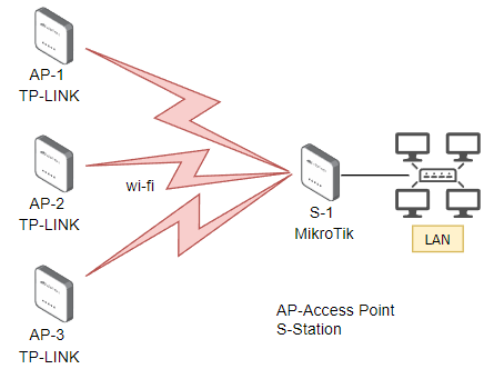 В организации действует 3 беспроводных моста, каждый со своей точкой доступа. Точки направлены перпендикулярно друг другу, но какие-то боковые лепестки диаграммы направленности попадают в филиал, где тестировался микротик. Такая ситуация представила возможность отработать взаимодействие станции с несколькими точками доступа для увеличения надежности связи с сервером и доступа в Интернет. Если откажет одна точка доступа, станция автоматически переключится на следующую.
