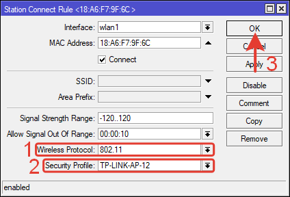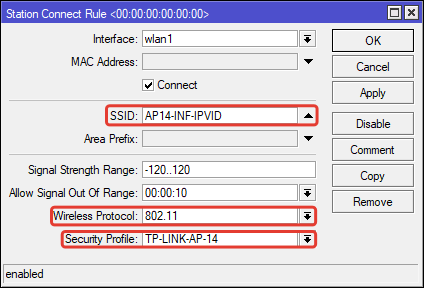 Interface: wlan1 – интерфейс к которому применяется правило CL. Если у станции будет несколько интерфейсов, например с разными рабочими диапазонами частот 2ГГц или 5ГГц, то можно выбрать нужный.