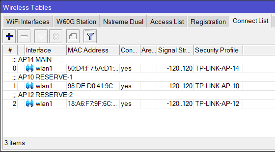 Правила с точками доступа расположены в порядки их подключения по наилучшему сигналу. AP14 принята за основную, AP10 и AP12 – резервные. Для понятности добавлено описание.