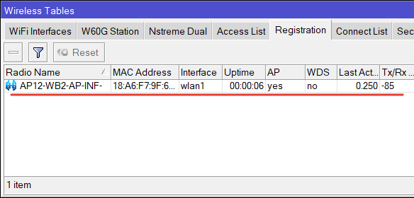 Проверяем работу этой схемы. Отключаем основную точку доступа и смотрим на вкладке «Registration» как станция переключается на резервную точку.