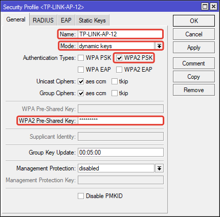 Security Profile: TP-LINK-AP – профиль безопасности. Для подключения к разным точкам разные профили с разными паролями.