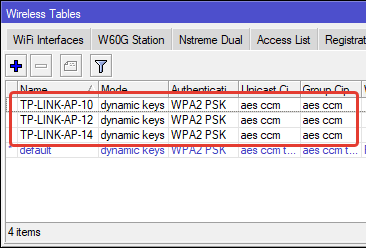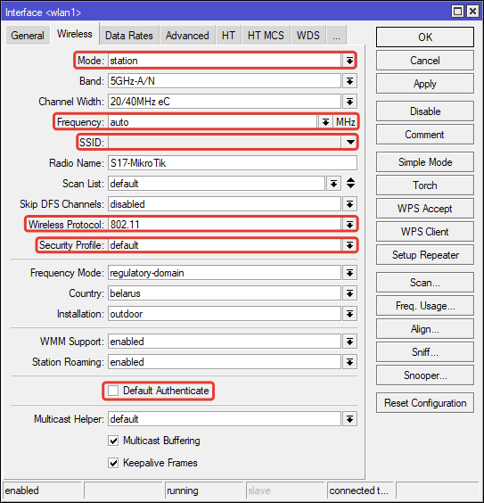Добавляем в CL по очереди все точки доступа. После этого нужно вернуть исходные значения в настройке интерфейса (SSID, Frequency, Security Profile) и снять галочку «Default Authenticate».