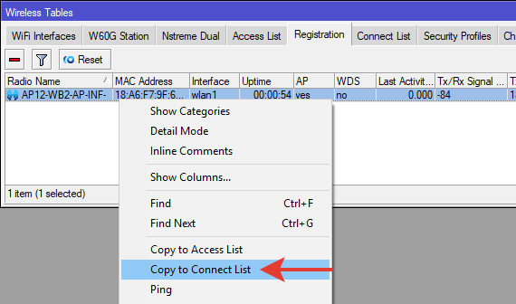 | /interface wireless connect—list add interface=wlan1 mac—address=1A:2B:3C:4D:5F:6E security—profile=TP—LINK—AP ssid=PC360RU wireless—protocol=802.11 |