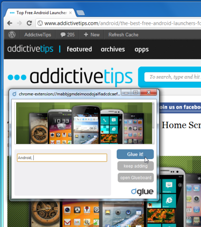 Текст, ссылка или изображение будут отображаться во всплывающем окне с Склейте !, продолжайте добавлять а также открыть клеевую доску параметры. После добавления тегов просто нажмите Приклейте! кнопку, чтобы добавить его на свой клей.