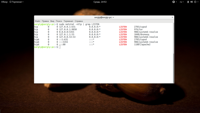 Это одна из самых старых и популярных утилит для просмотра открытых портов. Мы описывали её в отдельной статье, а сейчас просто кратко рассмотрим, как с ней работать. Чтобы посмотреть открытые порты, выполните такую команду: