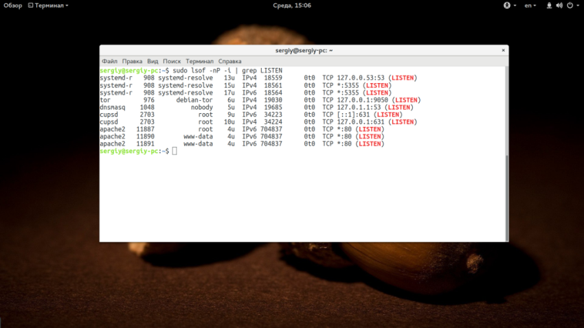 Утилита lsof тоже предназначена для просмотра открытых соединений. Основная ее функция — просмотр открытых файлов, но с её помощью можно посмотреть открытые порты Ubuntu. Используйте такие параметры: