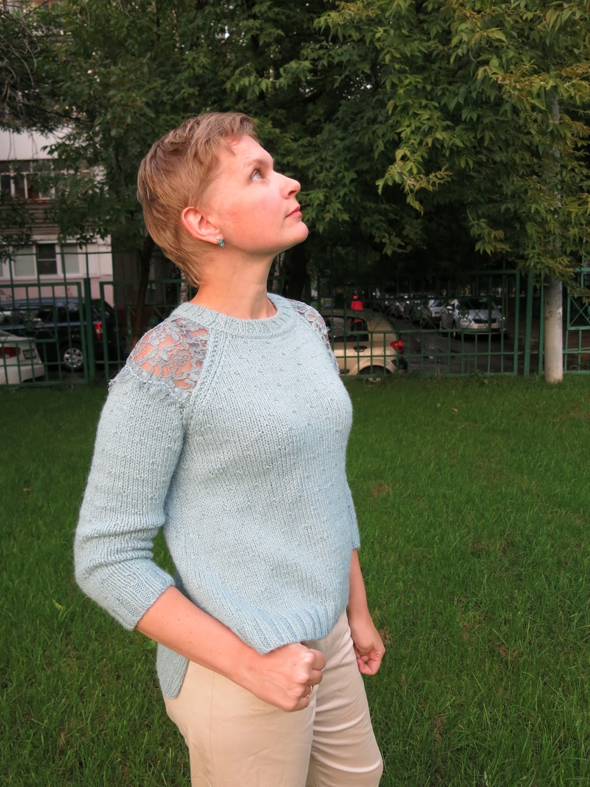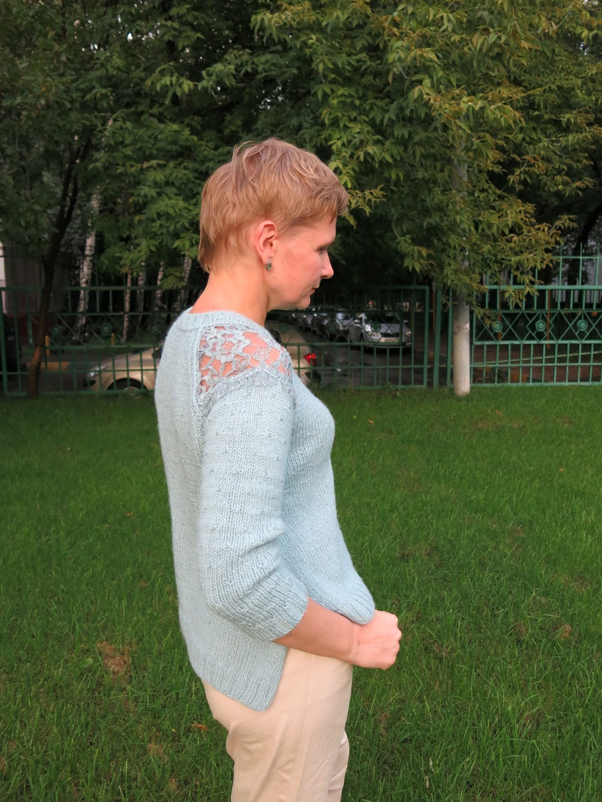 - потом уже к осени я решила поэкспериментировать и сделать вставку в вязаное изделие кружевного полотна. Мы ездили на фабрику Sophie Halette и привезли кружево от которого невозможно глаз отвести… правда, оно необычайно красивое. И вот в августе приезжает пряжа Carpe Diem в новом цвете 72 — такой цвет талой воды, но насыщеннее, и не мятный и не ментоловый а более спокойный водный цвет, назовем его аква… И точно такого же цвета было кружево. В общем, решила я совместить эти два материала в одном изделии. Вот что получилось: