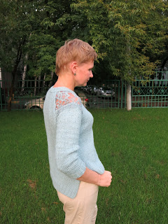 Пряжа Carpe Diem Lang Yarns, кружево Sophie Halette хлопковое. Кружево ввязано в регланные линии, внутрь бейки горловины (пришлось располовинивать нить при вязании кармана для горловины на изнанке), а реснички решила выпустить наружу по плечам 🙂
