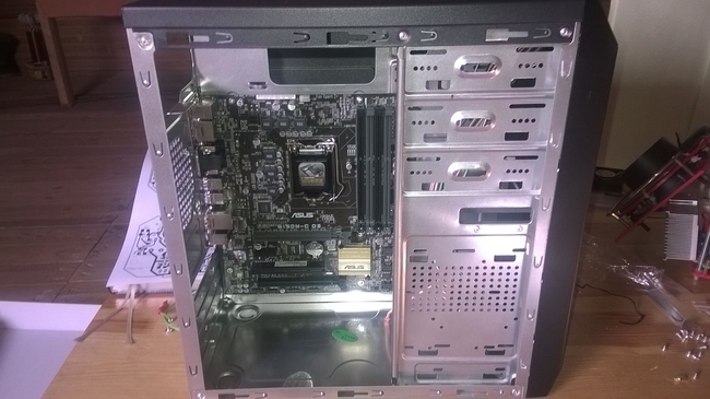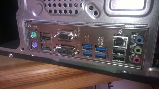 Прежде чем вставлять мат.плату в корпус, нужно проверить, чтоб пластинка с прорезями для разъемов нормально стыковалась с разъемами. В данном компьютер пришлось надеть эту пластину на разъемы и только потом вставить в корпус.
