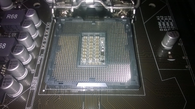 Устанавливаем процессор в сокет. Вставить его можно только одним способом. Ориентироваться нужно по двум полукруглым выемкам на боках в верхней части и в левом нижнем углу есть небольшой золотой треугольник.
